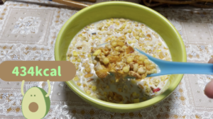 今日の朝ごはんはフルーツグラノーラです。ぶっかけているのは豆乳です。