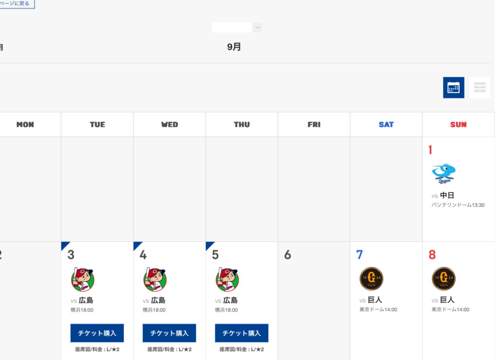 - 9月1日(日) 名古屋 中日 vs De 13:30~