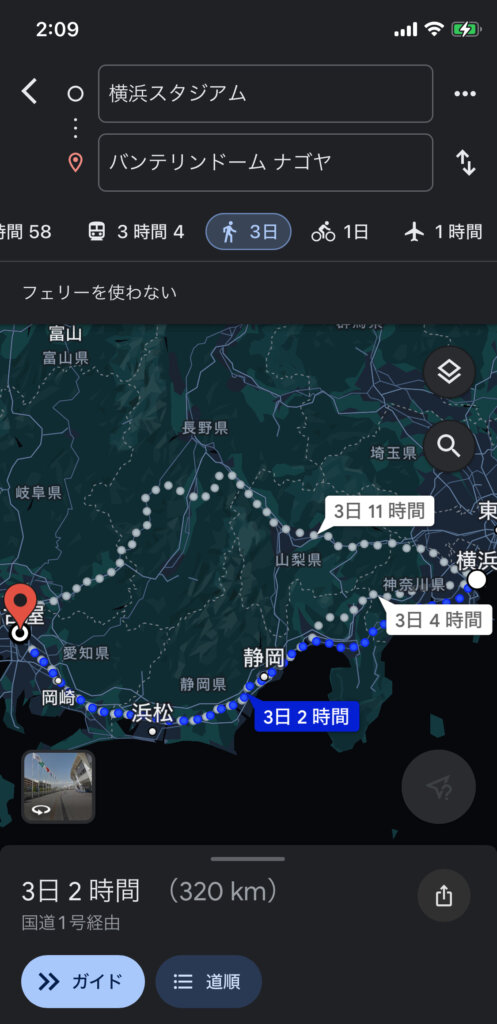 夜中の2時に何をやっているんだという問題はさておき、GoogleMapsから3つのルートが提示された。